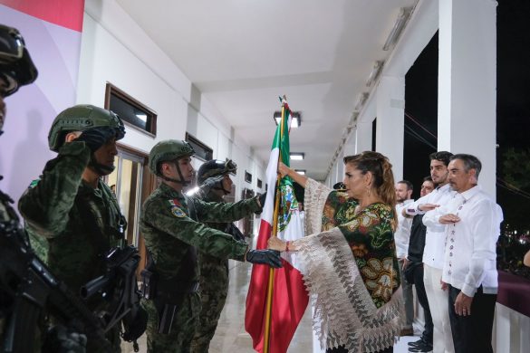 Durante el solemne acto del CCXIII (213) Aniversario del Grito de la Independencia de México, Mara Lezama ondeo la bandera Mexicana, mientras que el Coro y la Banda de Música del Estado entonaron los himnos a Quintana Roo y Nacional Mexicano, cerrando con los honores a la Bandera de México.