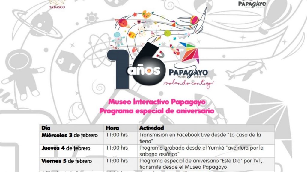 Tabasco, 02 febrero; poderycrítica.-Con una jornada de actividades creativas y divertidas que se desarrollará de manera virtual del 2 al 5 de febrero, el Museo Interactivo Papagayo celebra su 16 aniversario como espacio de educación no formal, que estimula a los niños a aprender mediante el juego a través de sus salas temáticas e interactivas.