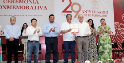 PODER Y CRÍTICA | REDACCIÓN | Al conmemorar el 29 aniversario de su fundación, la Universidad Popular de la Chontalpa y su rector, Mauro Winzig Negrín, hicieron entrega de reconocimientos a los ex rectores Fernando Calzada Falcón, Pedro Javier Muñoz Vergara, al profesor fundador Armando Padilla Herrera y a la egresada Mari Luz Velázquez Jiménez, alcaldesa electa de Huimanguillo.