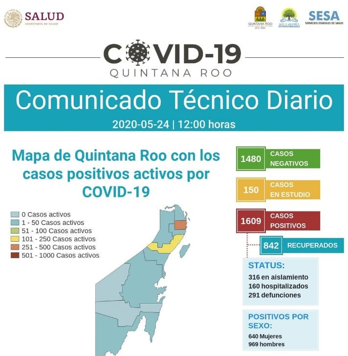 Chetumal, Q. Roo, Domingo 24 de Mayo de 2020, poderycrítica.- Al mediodía de este domingo, Quintana Roo registra 291 decesos por consecuencia de complicaciones de Covid 19.