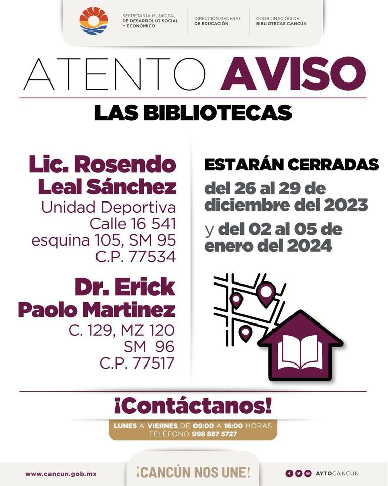 PODER Y CRÍTICA | REDACCIÓN | Autoridades del Municipio de Benito Juárez dieron a conocer que las bibliotecas públicas Licenciado Rosendo Leal Sánchez y Doctor Erick Paolo Martínez, estarán cerradas a la ciudadanía en general del 26 de diciembre del 2023 al 7 de enero del 2024, para reiniciar actividades el día lunes 8 de enero.