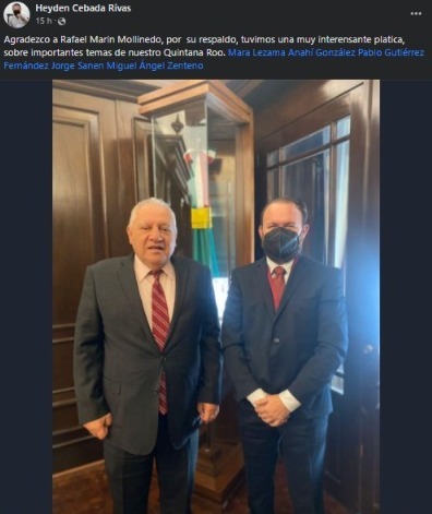 El día de ayer, Heyden José Cebada Rivas posteó en su cuenta personal de Facebook: «Agradezco a Rafael Marín Mollinedo, por su respaldo, tuvimos una muy interesante plática, sobre importantes temas de nuestro Quintana Roo», etiquetando la misma a Mara Lezama, Anahí González, Pablo Gutiérrez Fernández, Jorge Sanen y Miguel Ángel Zenteno, acompaña de una fotografía en donde se le ve de pie acompañado de Rafael Marín Mollinedo, director general del Programa para el Desarrollo del Istmo de Tehuantepec y fuerte aspirante a la gubernatura de Quintana Roo.