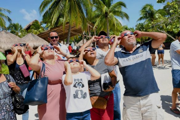 Desde las diez de la mañana, las y los cozumeleños abordaron las camionetas que los trasladaron hasta el parque Chankanaab, donde el personal de la FPMC los recibió y atendió para que pudieran observar el eclipse de manera segura con ayuda de lentes, así como un telescopio que otorgó en préstamo el planetario de Cozumel, Cha’an Ka’an.