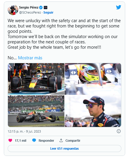 ‘Checo’ Pérez fue sexto este domingo en el Gran Premio de Gran Bretaña, después de haber comenzado decimoquinto en la parrilla de salida.
