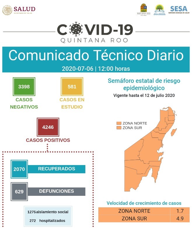 «Hasta las 12 horas del 6 de julio, se han notificado 3398 casos negativos, 581 en estudio, 4246 positivos, 629 defunciones y 2070 personas recuperadas a Covid 19», detalló la Secretaría de Salud.