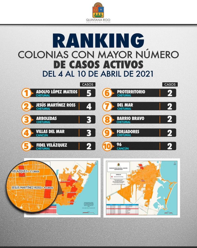 En el programa, se presentó el ranking de las colonias de quintana Roo con más casos activos de Covid-19, las cuales quedan de la siguiente manera: