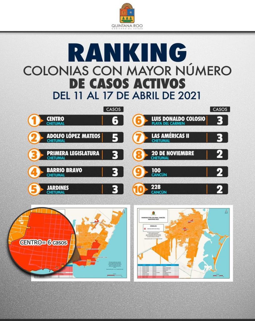 En el caso del rankig estatal se informó que, por enésima vez, la ciudad de Chetumal es el epicentro de casos Covid-19 en el estado, al ocupar siete de las diez posiciones de la lista.