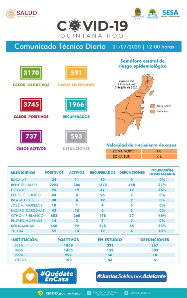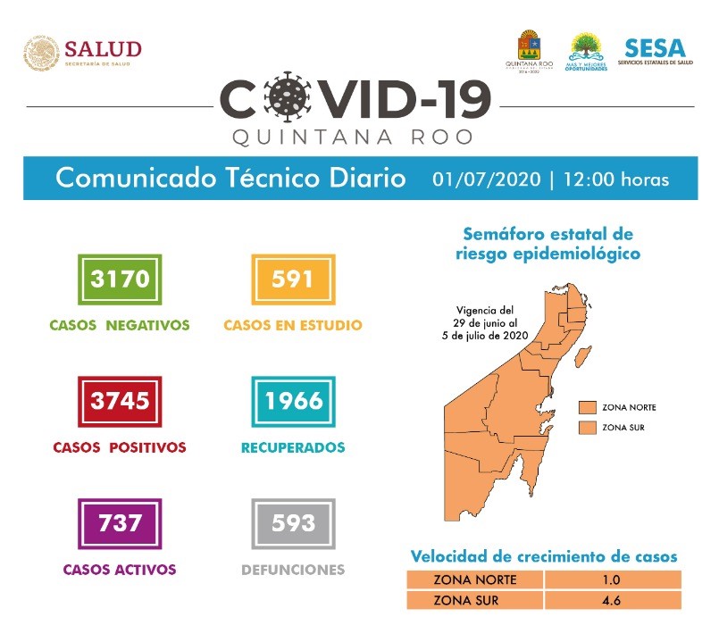 «Hasta las 12 horas del 1 de julio, se han notificado 3170 casos negativos, 591 en estudio, 3745 positivos, 737 casos activos, 593 defunciones y 1966 personas recuperadas a Covid-19», añadió la Secretaría de Salud en el Estado, al referirse al panorama general de Quintana Roo.