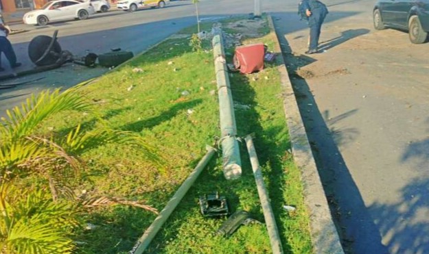 La peor parte se la llevó la camioneta particular, con daños en su costado derecho y parte trasera. Además, producto del impacto un poste de alumbrado público cayó sobre la banqueta.