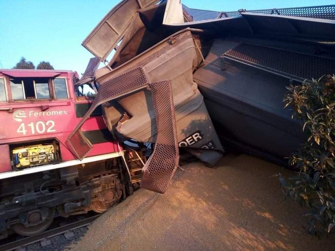 El impacto provocó que dos vagones quedaran cruzados en medio de la vía, además se introdujeron a una casa habitación y causar severos daños ya que las ruedas de estos terminaron completamente dentro de la casa; además, se derramó la carga de maíz que transportaban.