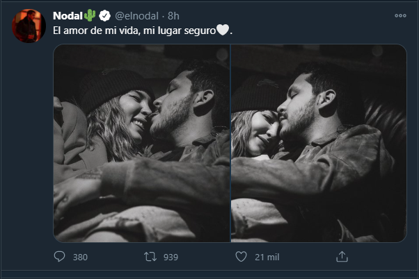 A través de su cuenta de Twitter, Christian Nodal compartió unas imágenes en las que aparece abrazando y besando a Belinda, a quien también le dedicó un conmovedor mensaje.