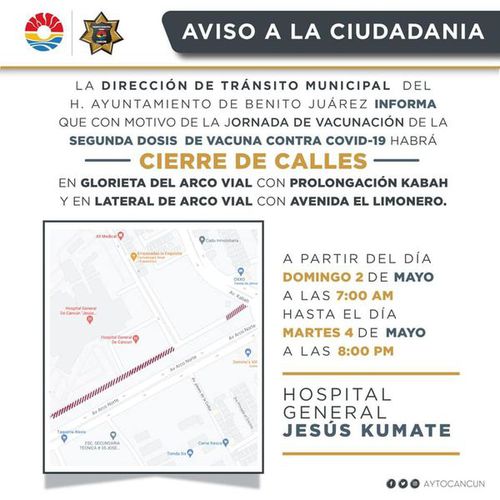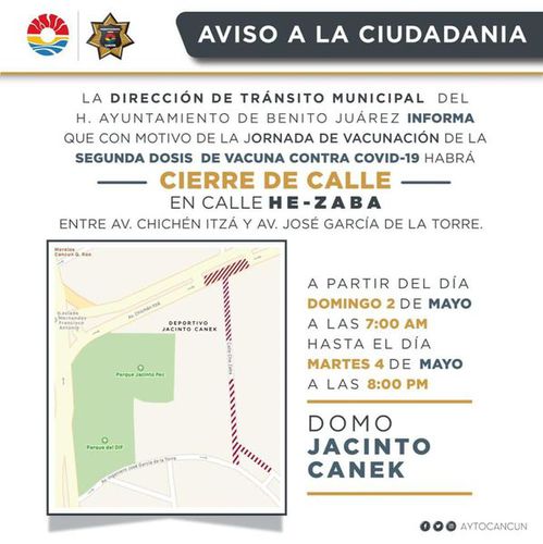 Cancún, Q. Roo, Domingo 02 de Mayo de 2021, poderycrítica.- Con motivo de la jornada de vacunación para la aplicación de la segunda dosis de la vacuna Sinovac contra el COVID-19 a los adultos mayores, autoridades municipales dieron a conocer el cierre de algunas calles a partir de este domingo 2 de mayo hasta el martes 4 de mayo.