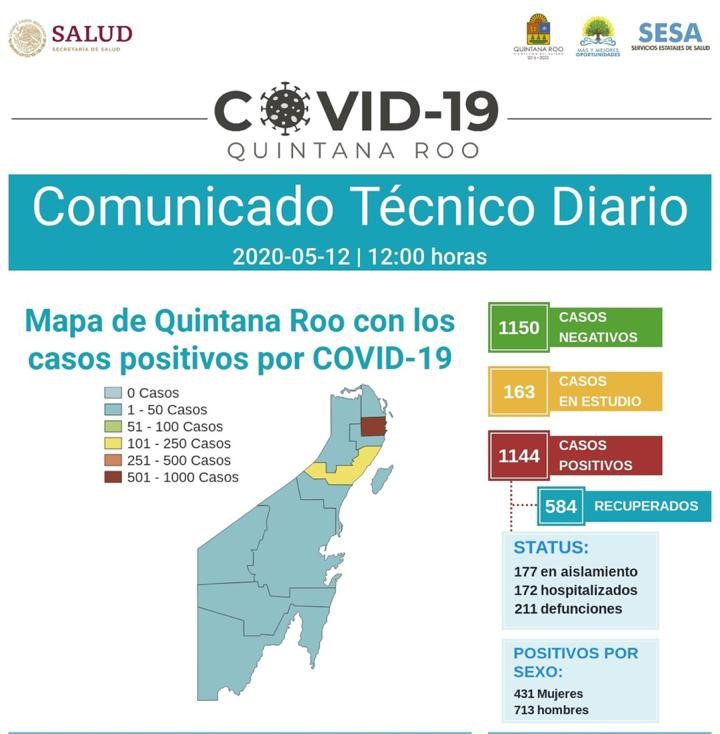 Chetumal, Q. Roo, Martes 12 de Mayo de 2020, poderycrítica.- La Secretaría de Salud en el Estado reportó al mediodía de hoy martes que van mil 144 casos positivos de coronavirus en Quintana Roo.