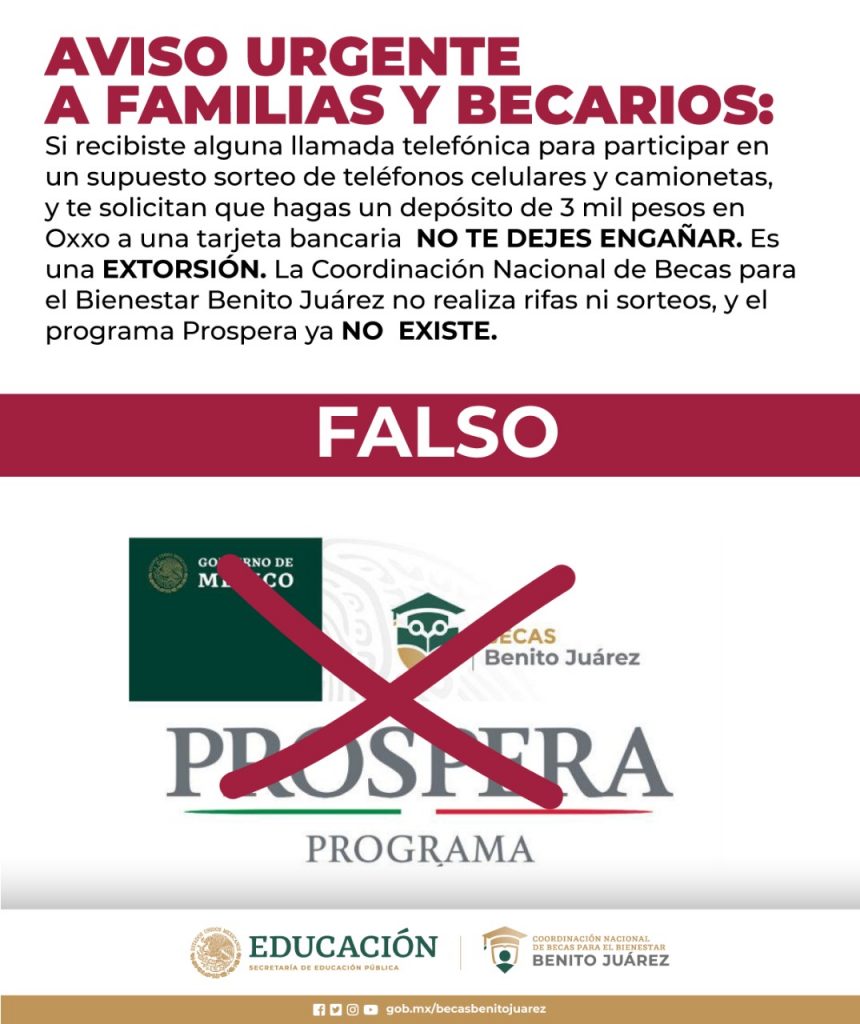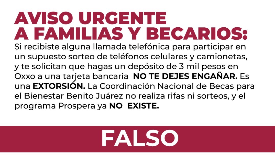 Ciudad de México, Domingo 19 de Abril de 2020, poderycrítica.- La Coordinación Nacional de Becas para el Bienestar Benito Juárez detectó información FALSA que tiene como fin EXTORSIONAR a las y los estudiantes y a las familias que tienen una beca del Gobierno de México.