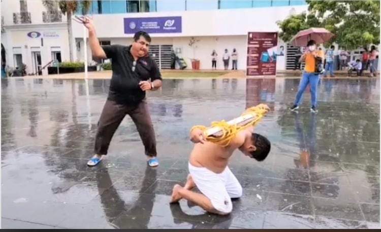 Miguel es un ciudadano de la colonia Gaviotas (Villahermosa) y protestó permitiendo le dieran golpes de tipo látigo en la espalda y cargaba unos palos que simulaban una cruz.