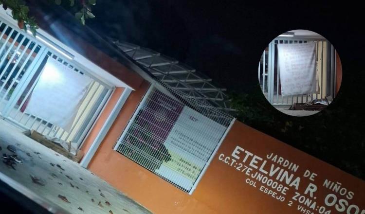 PODER Y CRÍTICA | REDACCIÓN | La noche de ayer, una manta con un mensaje amenazante apareció colgada en el portón del jardín de niños «Etelvina R. Osorio», en la colonia El Espejo II.
