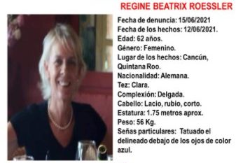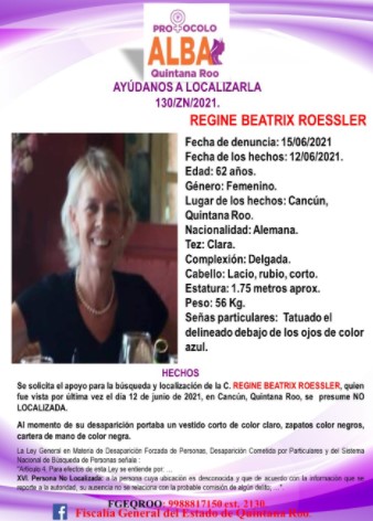 A través del “Protocolo Alba”, se pide ayuda para localizar a Regine Beatrix Roessler vista por última ocasión el 12 de junio de 2021 en el municipio de Benito Juárez, Quintana Roo.