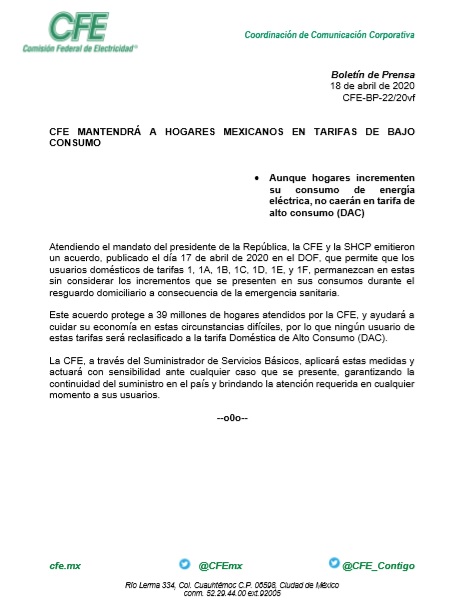 Ciudad de México, 18 de abril de 2020.- Atendiendo el mandato del presidente de la República, la CFE y la SHCP emitieron un acuerdo, publicado el día 17 de abril de 2020 en el DOF, que permite que los usuarios domésticos de tarifas 1, 1A, 1B, 1C, 1D, 1E, y 1F, permanezcan en estas sin considerar los incrementos que se presenten en sus consumos durante el resguardo domiciliario a consecuencia de la emergencia sanitaria.