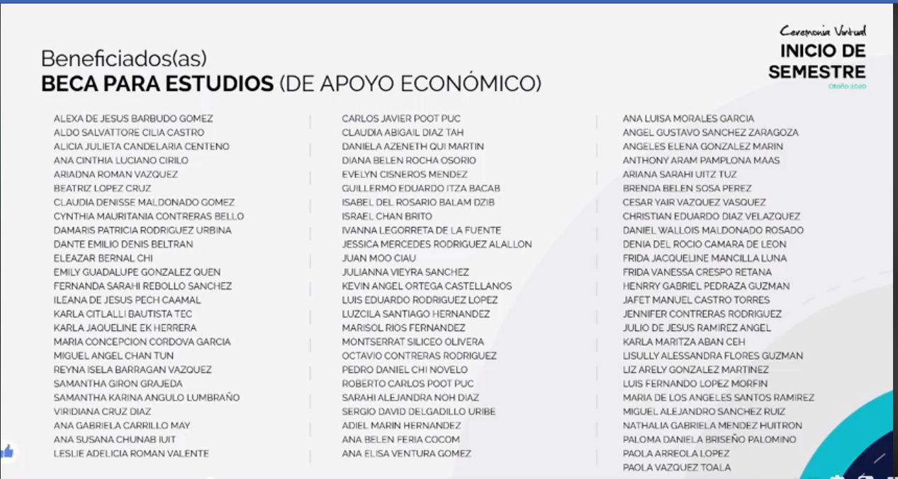 La Yumaira Gutiérrez Bernat, responsable de Becas del Departamento de Servicios Escolares, informó que además, este periodo de Otoño 2020, la Universidad de Caribe otorgó 144 becas de apoyo económico, que cubren los 2 mil 140 pesos del monto de la reinscripción; así como 18 becas de excelencia estudiantil que además de dicha cantidad, los estudiante reciben mil pesos durante seis meses, para sumar un incentivo económico de 8 mil 140 pesos.