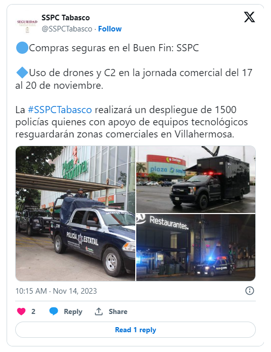 Poder y Crítica | Redacción | A través de redes sociales, la Secretaría de Seguridad y Protección Ciudadana (SSPC) en Tabasco, dio a conocer que, tras la llegada de El Buen Fin, se hará un despliegue de mil 500 elementos policiales para salvaguardar a los comerciantes y compradores tabasqueños.