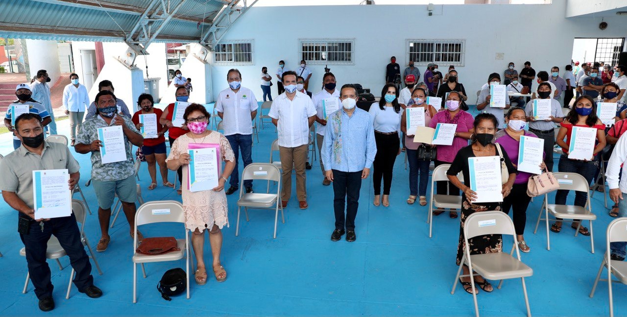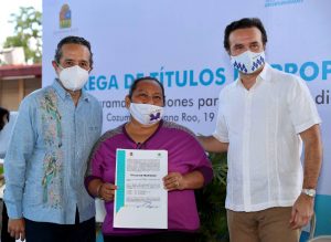 En el parque de Los lápices, de Cozumel, el gobernador entregó siete títulos de propiedad de manera simbólica, como parte del paquete de apoyos que garantiza en Quintana Roo un crecimiento sustentable, y permite a las familias avalar y asegurar la casa donde viven.