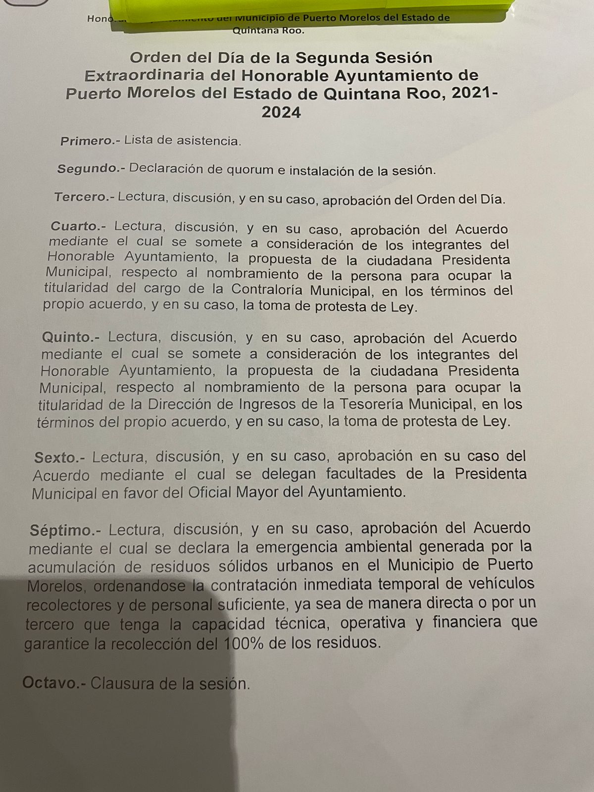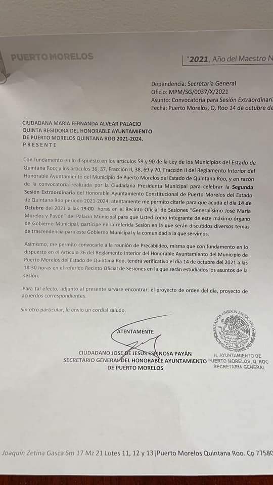 Puerto Morelos, Q. Roo, Jueves 14 de Octubre de 2021, poderycrítica.- Luego de que la quinta regidora en Puerto Morelos y representante del Partido del Trabajo, María Fernanda Alvear Palacios, solicitara ante la Cámara de Diputados se abriera juicio político contra la presidenta municipal, Blanca Merari Tziu Muñoz, esta noche sesión extraordinaria en el Cabildo y se dio marcha atrás a los nombramientos que la alcaldesa había hecho sin consultar con todos los regidores.