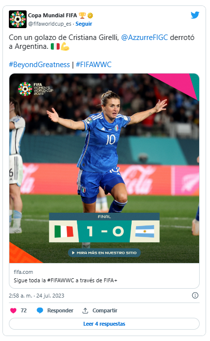 Poder y Crítica | Redacción | La selección de Italia derrotó este lunes a su similar de Argentina 1-0 con un gol agónico en el final de un partido intensamente disputado en el debut de ambas selecciones en el Mundial Femenil de Australia y Nueva Zelanda 2023.