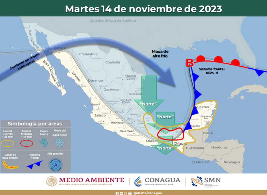 Asimismo, persistirá el evento de “Norte” con rachas de 70 a 90 km/h y oleaje de 2 a 4 m de altura en costas de Veracruz y Golfo de Tehuantepec, y evento de “Norte” con rachas de 50 a 70 km/h y oleaje de 1 a 3 m de altura en costas de Tamaulipas y Tabasco.