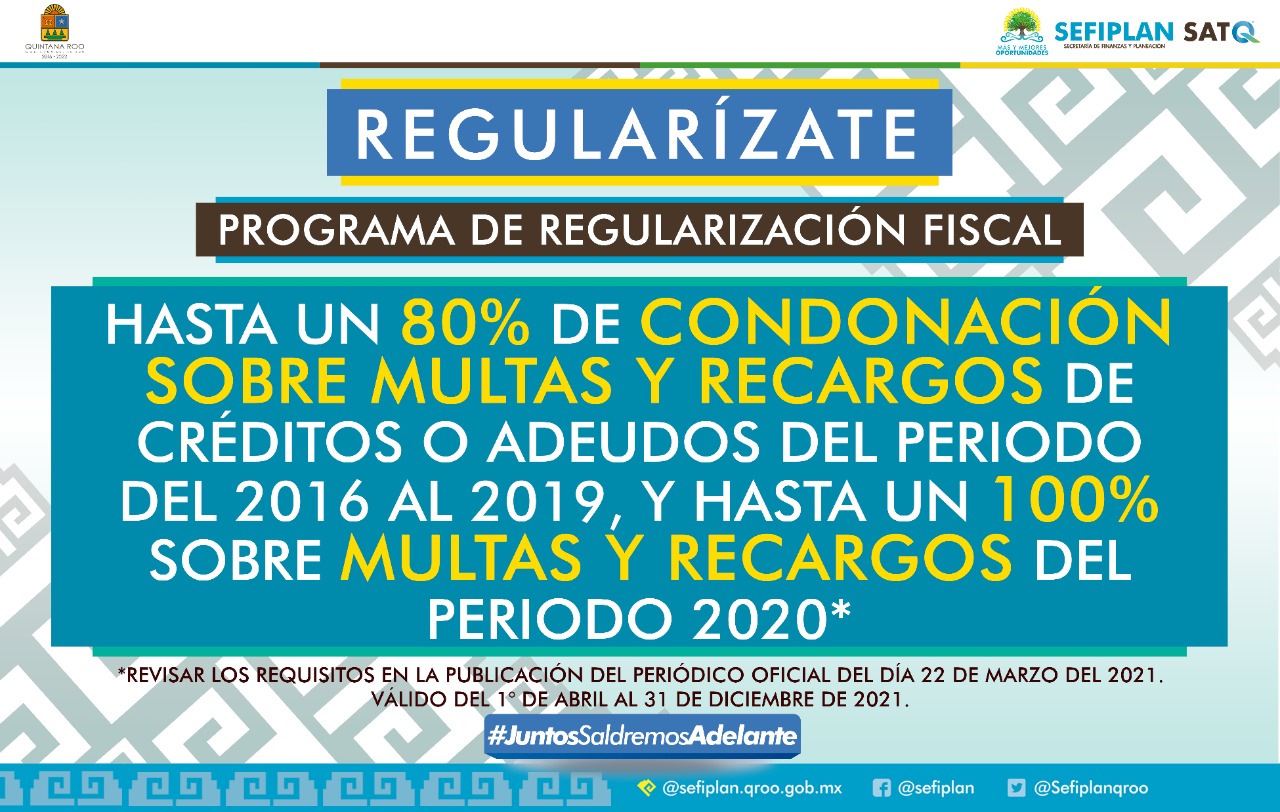 Chetumal, Q. Roo, viernes 26 de marzo de 2021, poderycrítica.- El próximo uno de abril entrará en vigor el Programa de Regularización Fiscal 2016-2020 en apoyo a los pequeños contribuyentes. La condonación de multas y recargos podrá ser total o parcial, y se aplicará solamente sobre adeudos y créditos fiscales estatales; se otorgará hasta un 80% de condonación sobre multas y recargos de créditos o adeudos del periodo 2016 al 2019, y hasta un 100% sobre multas y recargos del periodo 2020.