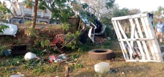 El impacto fue tal que todo el frente de la camioneta, quedó destrozada y la caja de redilas que llevaba en la parte trasera, salió disparada de su base, así como todos los implementos que llevaba de su trabajo.