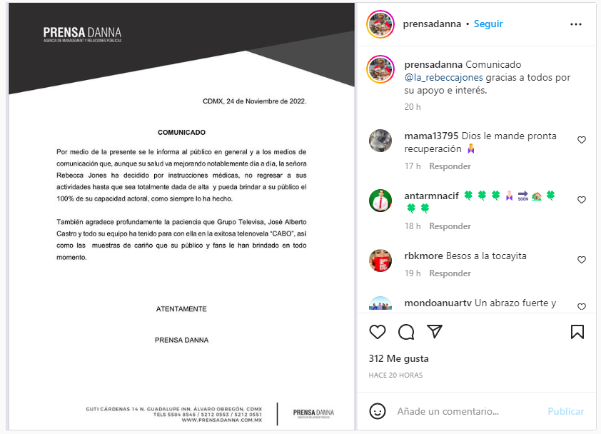 A través de un comunicado oficial, Danna Vázquez, su representante, reveló que, aunque la salud de Jones ha mejorado notablemente, por consejo de sus médicos no volverá al trabajo, por lo menos hasta que haya sido dada de alta y no implique ningún riesgo para ella.
