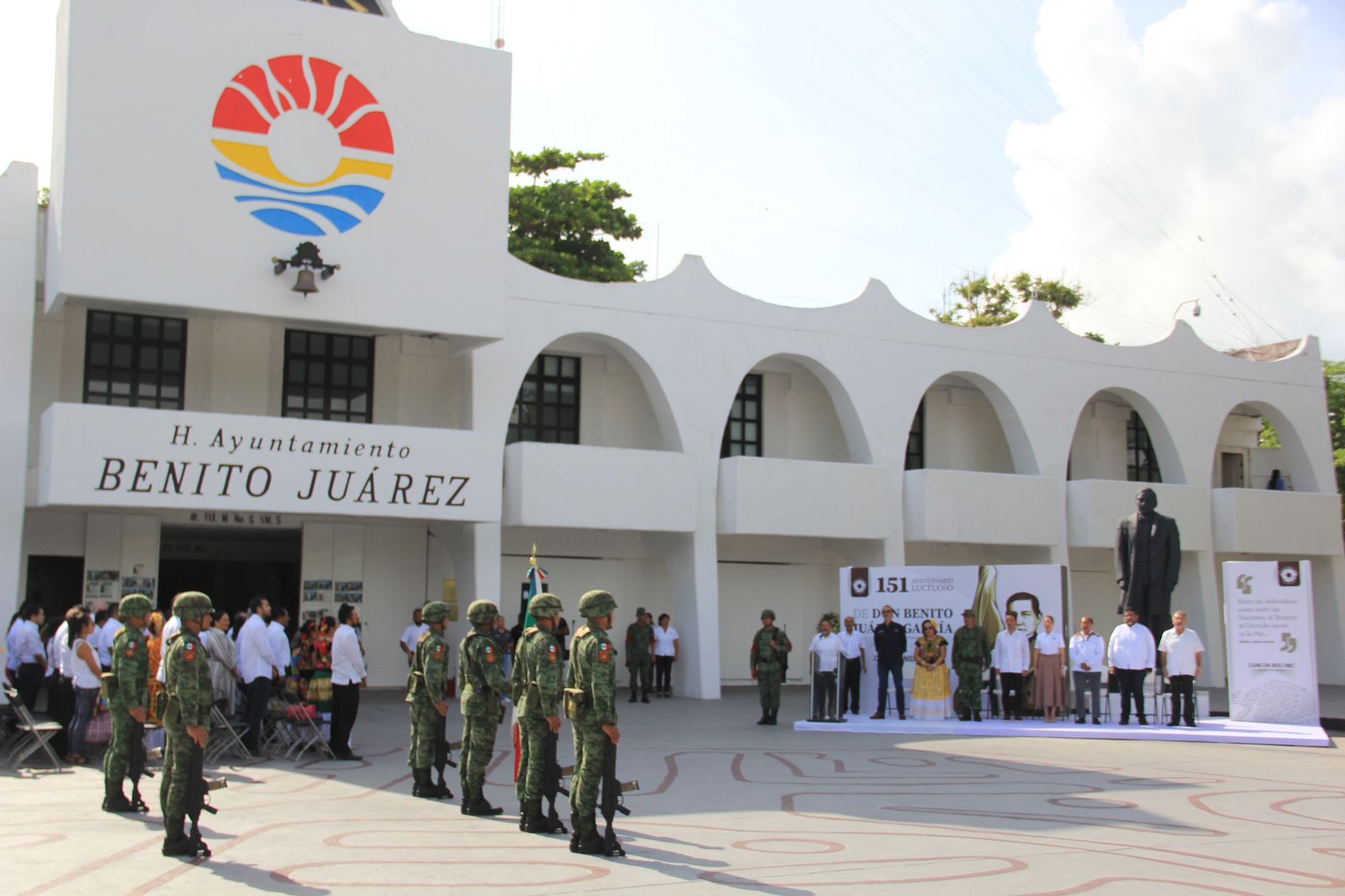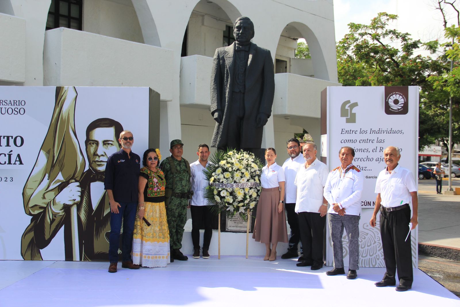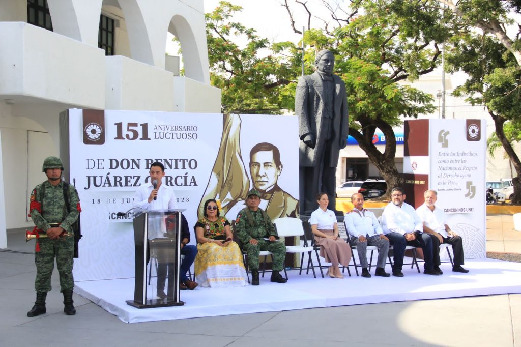 “El legado de Don Benito Juárez continúa siendo un pilar fundamental en la construcción del gran proyecto de transformación que lleva a cabo nuestro presidente, Andrés Manuel López Obrador, al que se ha sumado nuestra gobernadora del estado, Mara Lezama y por supuesto, la administración del municipio de Benito Juárez, a través de la Presidenta Municipal, Ana Paty Peralta”, dijo el secretario general del Ayuntamiento, Pablo Gutiérrez Fernández, durante su intervención en la explanada de Plaza de La Reforma, en representación de la Alcaldesa.