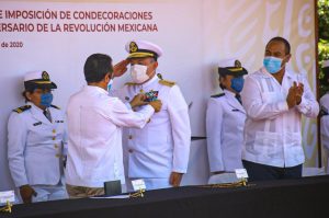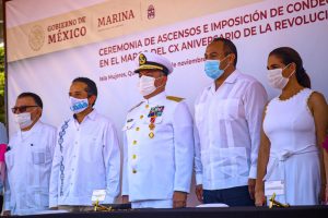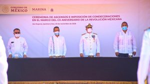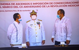 Isla Mujeres, Q. Roo, Viernes 20 de Noviembre del 2020, poderycrítica.- En conmemoración al CX aniversario del inicio de la Revolución Mexicana, el presidente municipal, Juan Carrillo Soberanis acompañó al gobernador del Estado, Carlos Joaquín González y al almirante, José Luis Vergara Ibarra, comandante de la Quinta Región Naval en la ceremonia de Ascensos e Imposición de Condecoraciones de la Quinta Región Naval de Isla Mujeres, en el marco de un aniversario más de la Revolución en México.