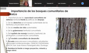 La doctora Leticia Merino Pérez coordinadora del Seminario Universitario de Sociedad, Medio Ambiente e Instituciones de la UNAM destacó la importancia de la propiedad ejidal. “Es mucho más fácil –dijo- y coherente en términos de ecología, manejar un bosque colectivo que un bosque parcelado, da la posibilidad de escala que requiere el manejo territorial, para la protección, conservación, producción sustentable y protección de la flora y fauna.
