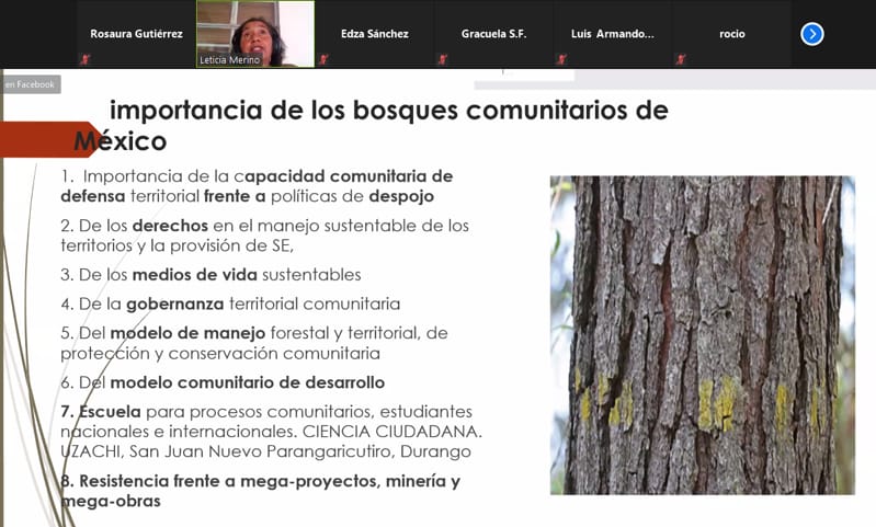 Merino Pérez especificó que las comunidades forestales son en muchos casos, núcleos de resistencia frente a la expansión de megaproyectos que despojan a las comunidades de los recursos y los medios de vida que destruyen el agua, cuencas, suelo y vegetación, como es el caso de la expansión de las granjas porcícolas en la península de Yucatán en el cinturón de cenotes o la expansión de las granjas de menonitas, dedicadas a la producción de soja.
