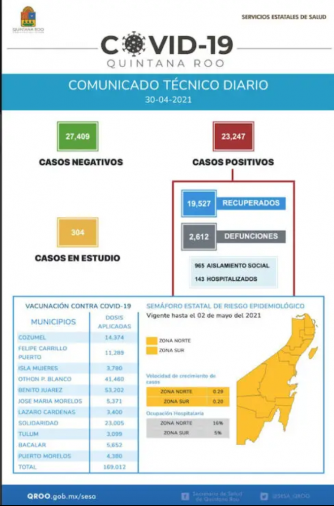 Cancún, Q. Roo, Viernes 30 de Abril de 2021, poderycrítica.- El gobernador Carlos Joaquín González, anunció que a partir del próximo lunes 3 de mayo todo el estado. regresa al color naranja del Semáforo Epidemiológico Estatal, la tendencia de contagios continua al alza.
