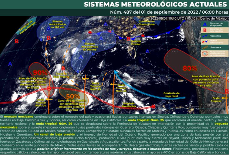 Por otra parte, la onda tropical Núm. 25 que recorrerá el oriente, centro y sur del territorio nacional y la onda tropical Núm. 26 que se desplazará sobre la Península de Yucatán en interacción con la proximidad de la vaguada monzónica sobre el sureste mexicano, originarán lluvias puntuales intensas en Guerrero, Oaxaca, Chiapas y Quintana Roo; puntuales muy fuertes en el Estado de México, Ciudad de México, Veracruz, Tabasco, Campeche y Yucatán; puntuales fuertes en Morelos y Puebla, así como chubascos en Tlaxcala, Hidalgo y Querétaro.