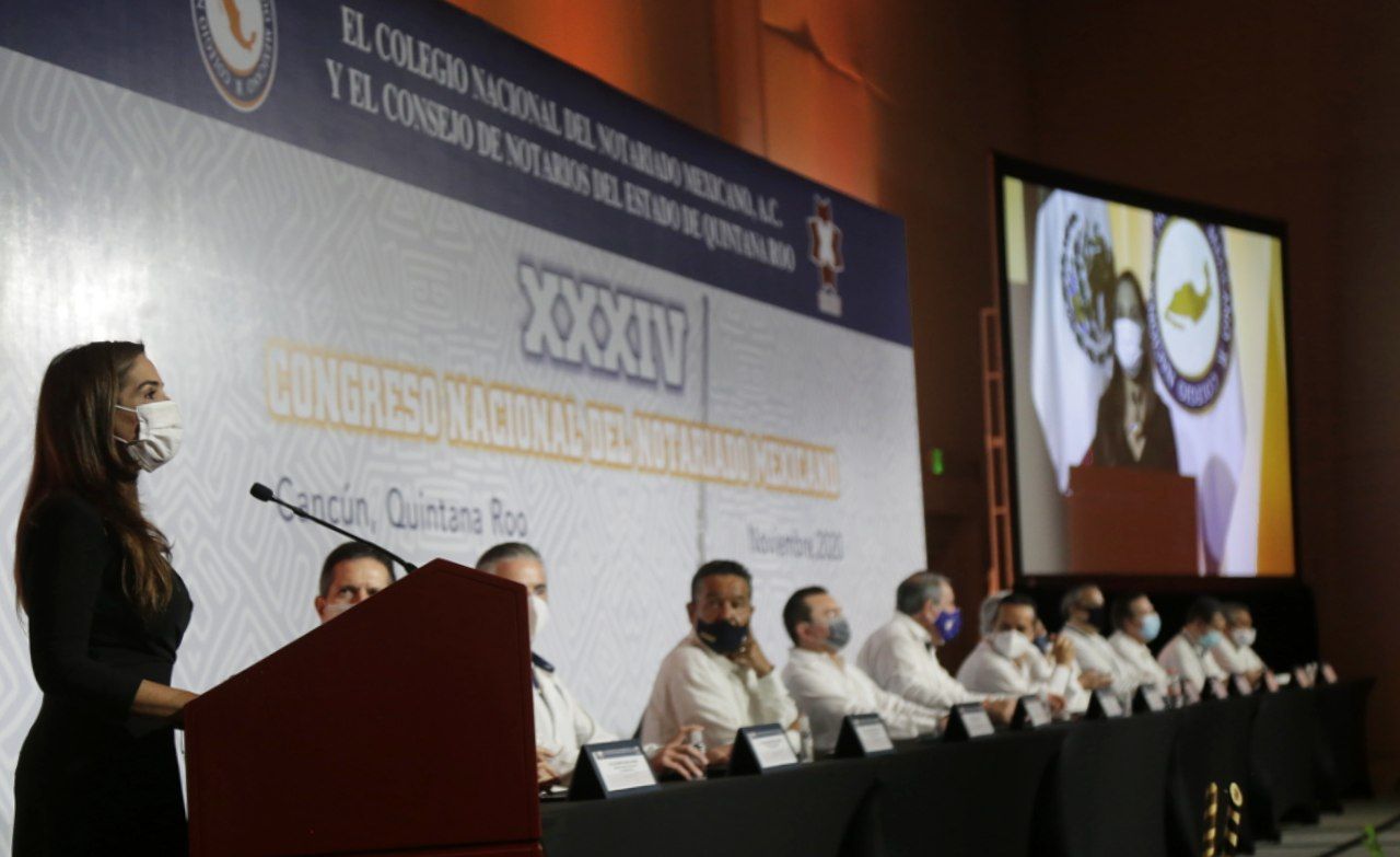 Ante el procurador agrario, Luis Rafael Hernández Palacios Mirón; el gobernador del Estado, Carlos Joaquín González; el presidente del Tribunal Superior de Justicia y del Consejo de la Judicatura del Estado, Magistrado José Antonio León Ruiz; y el presidente del colegio de esos profesionistas, Armando Javier Prado Delgado, la Presidente Municipal, Mara Lezama, invitó al notariado de todo el país a compartir la experiencia positiva de este polo vacacional que sigue siendo un precedente en el ramo.