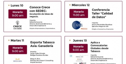 Todos los eventos serán transmitidos a través de Facebook/sedec.tab. También se invita a conocer las diversas convocatorias, donde se ofrecen opciones para las mujeres y hombres de negocios en: bit.ly/convocatabasco.