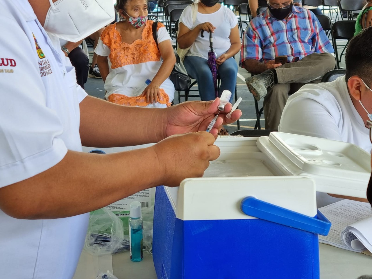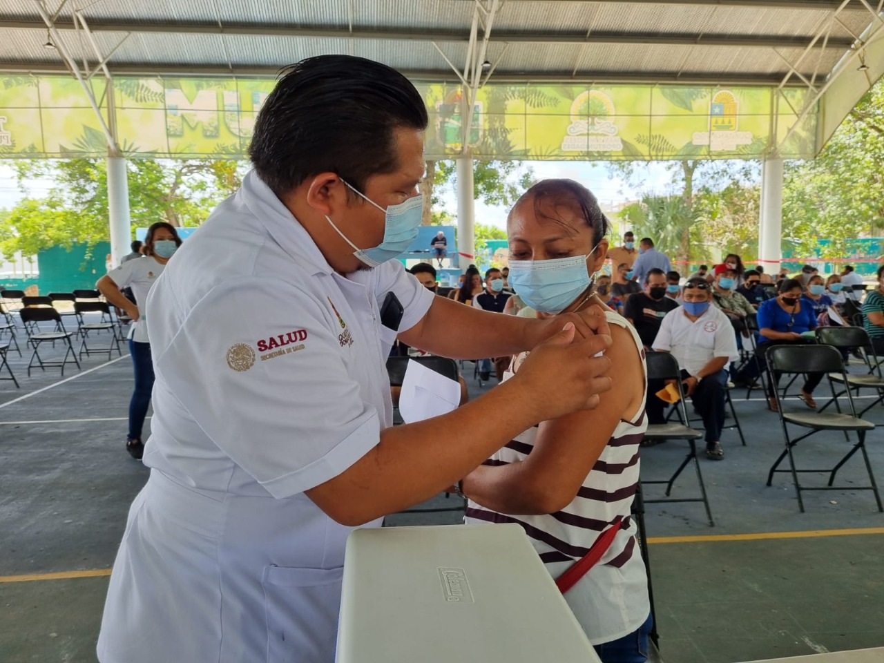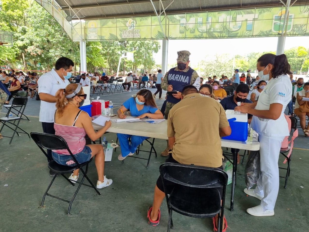 Tulum, Q. Roo, jueves 10 de junio de 2021, Poderycrítica.- Transcurre con gran afluencia de personas la jornada de vacunación de primera dosis contra covid-19 para adultos de 40 años a 49 años, con la meta de aplicar 5 mil 200 vacunas, así como la inmunización para personas de 50 años en adelante y mujeres embarazadas que por alguna razón no cuenten con la primera dosis.