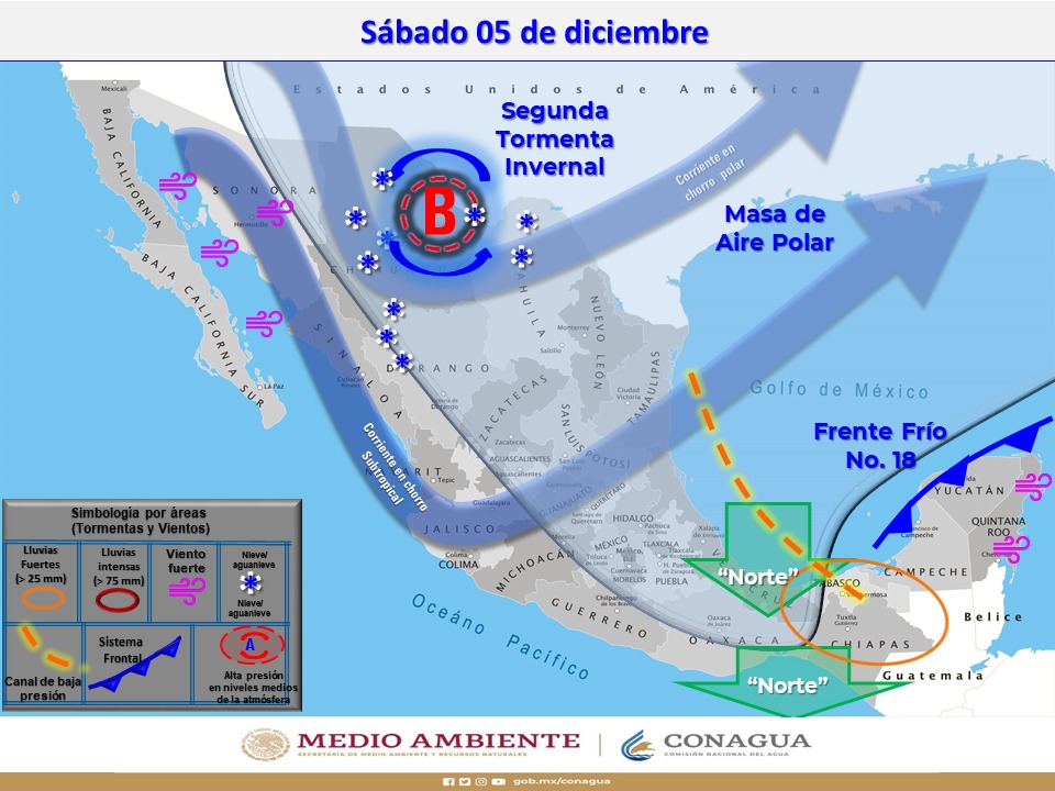La segunda tormenta invernal se desplazará lentamente sobre el norte del país y la masa de aire polar asociada al frente, cubrirá gran parte de la República Mexicana y continuará interactuando con la corriente en chorro subtropical; estas condiciones mantendrán ambiente frío a muy frío sobre gran parte del territorio nacional, así como fresco matutino sobre Quintana Roo.