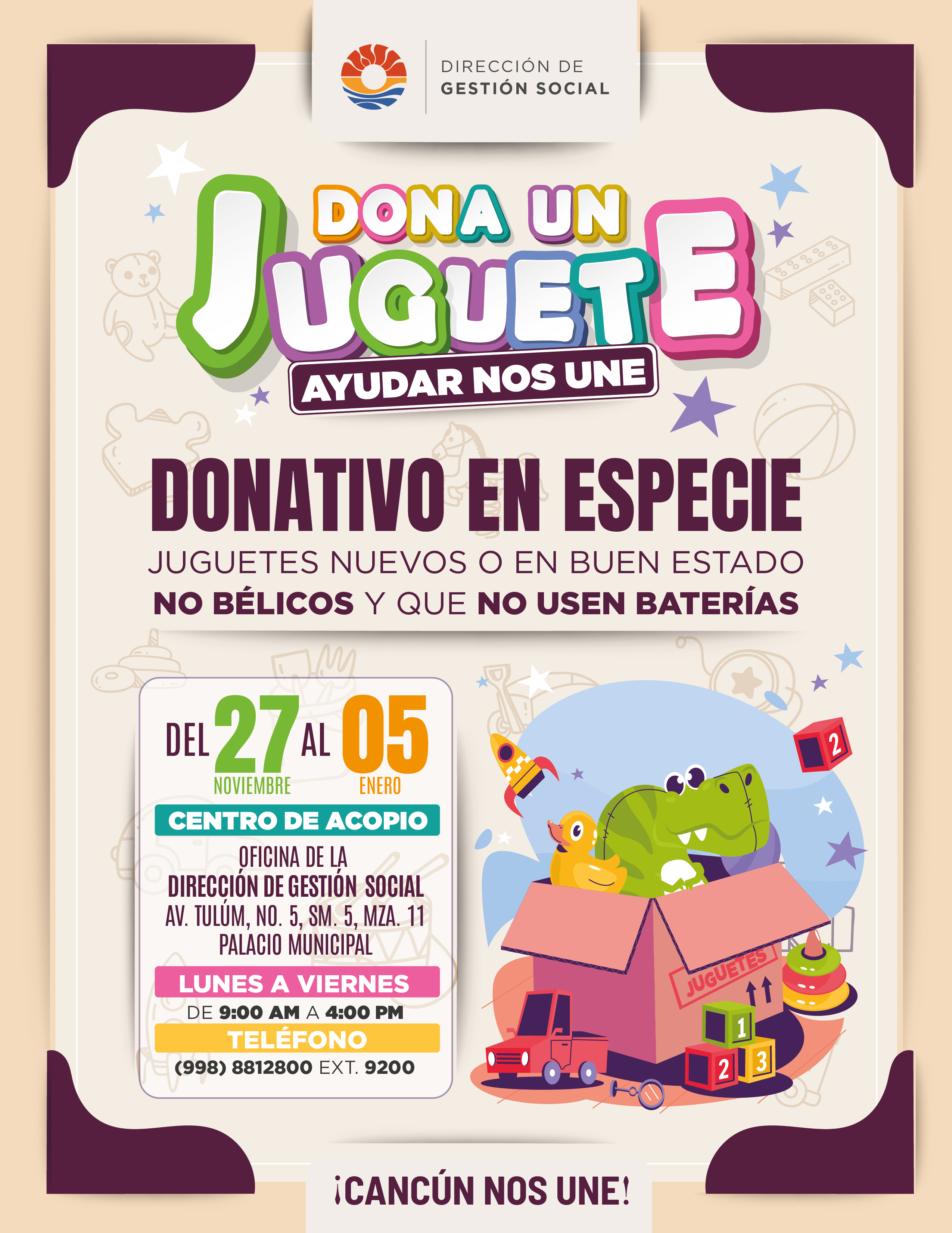 PODER Y CRÍTICA | REDACCIÓN | El Ayuntamiento de Benito Juárez, a través de la Dirección de Gestión Social, invita a las y los cancunenses a sumarse al programa “Dona un Juguete, ayudar nos une”, que inició este 27 de noviembre y con la cual se pretende llevar alegría a niñas y niños en diferentes colonias y Supermanzanas prioritarias de la ciudad.
