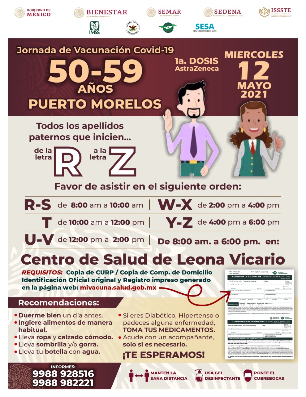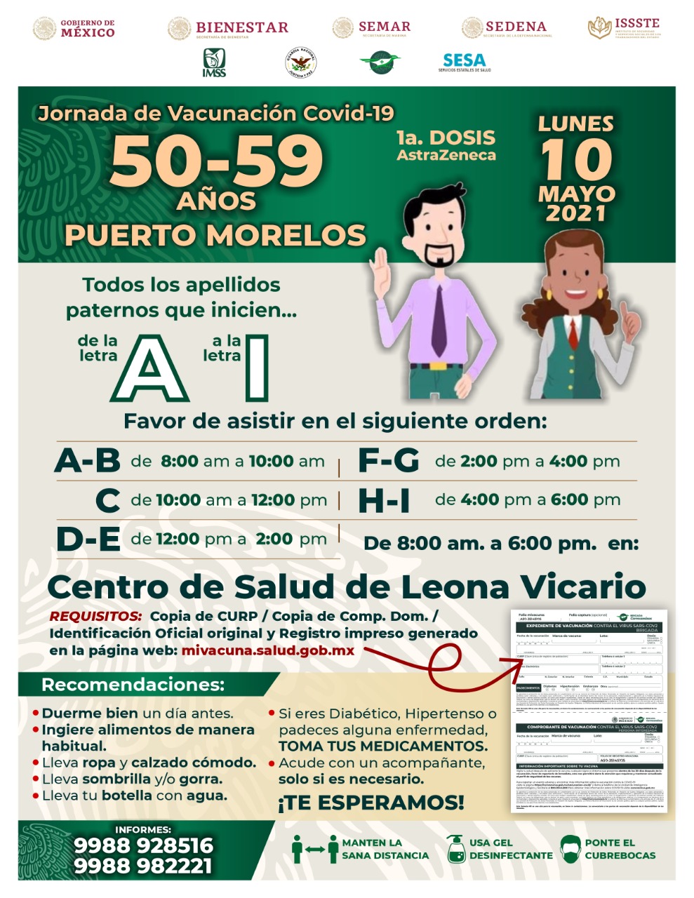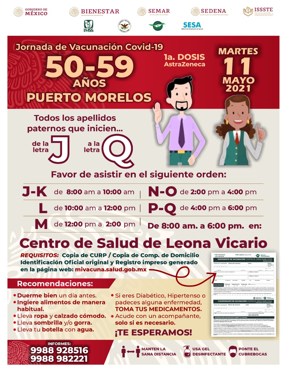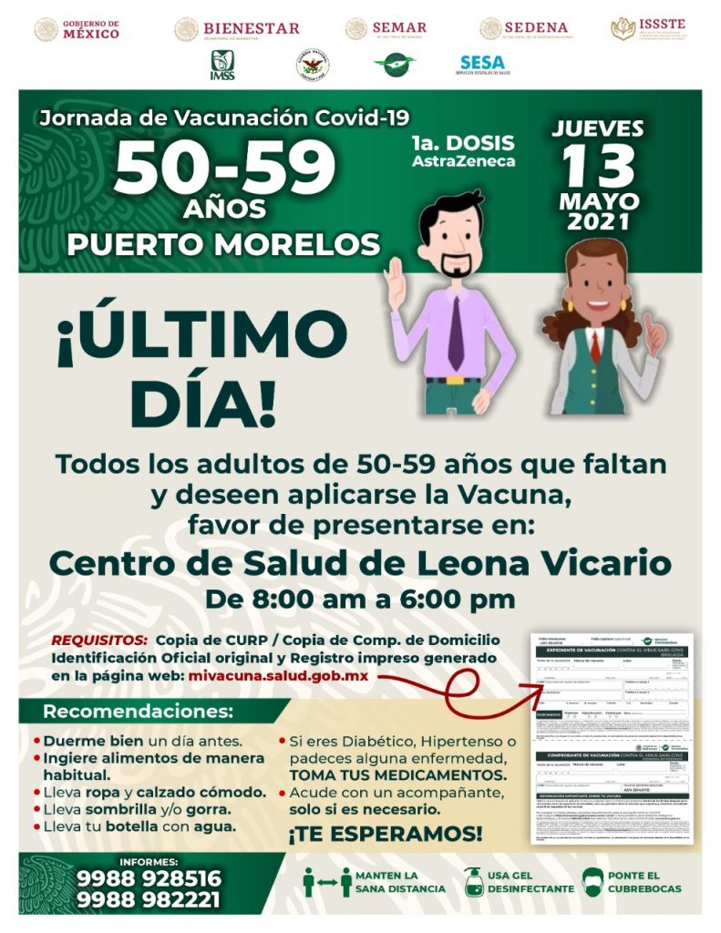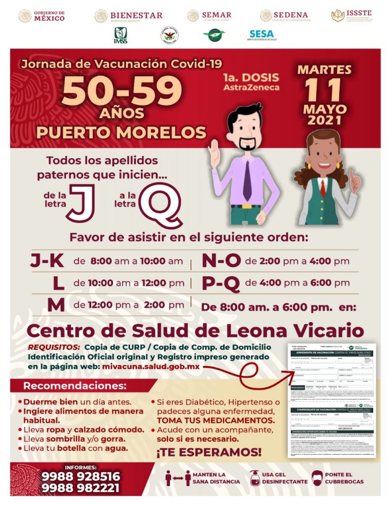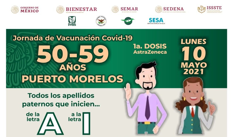 Puerto Morelos, Q. Roo, sábado 08 de mayo del 2021, poderycritica.- Del lunes 10 al jueves 13 de mayo se realizará la jornada de vacunación para personas fin rango de edad de 50 a 59 años que residan en Puerto Morelos.