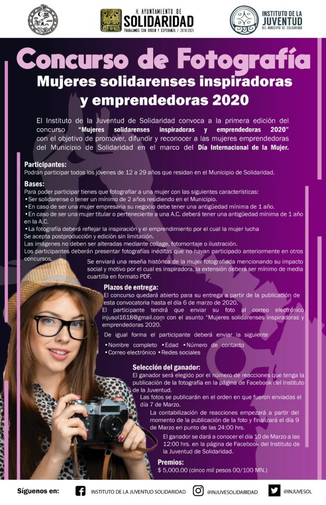 Playa del Carmen, Q. Roo, Miércoles 04 de Marzo de 2020, poderycrítica .-En el marco del “Día Internacional de la Mujer”, que se celebra el 8 de marzo, el Instituto de la Juventud de Solidaridad, lanzó la convocatoria para el “Concurso de Fotografía Mujeres Solidarenses Inspiradoras y Emprendedoras 2020”, a fin de reconocer a las mujeres solidarenses.