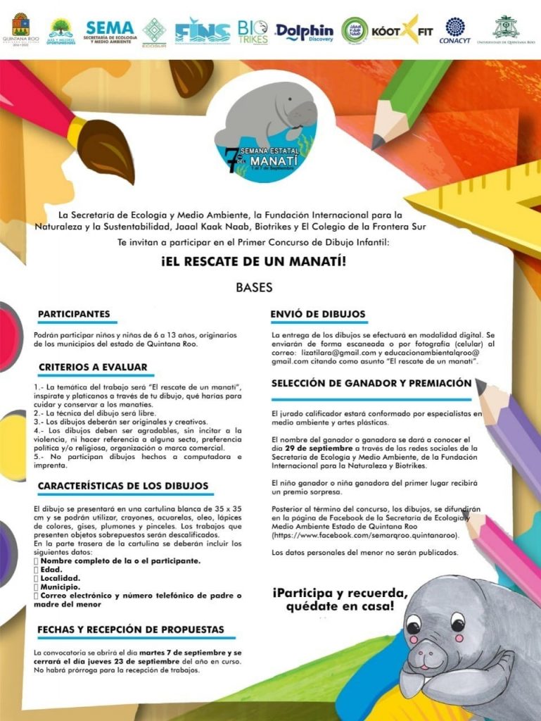 Chetumal, Q. Roo, Martes 14  de Septiembre de 2021, poderycrítica.-  El gobierno de Quintana Roo encabezado por Carlos Joaquín a través de la Secretaría de Ecología y Medio Ambiente (SEMA), en coordinación con la Fundación Internacional para la Naturaleza y la Sustentabilidad, Biotrikes y El Colegio de la Frontera Sur convocan a niños y niñas de 6 a 13 años, originarios de los municipios del estado de Quintana Roo a participar en el Primer concurso de dibujo infantil: el rescate de un manatí.