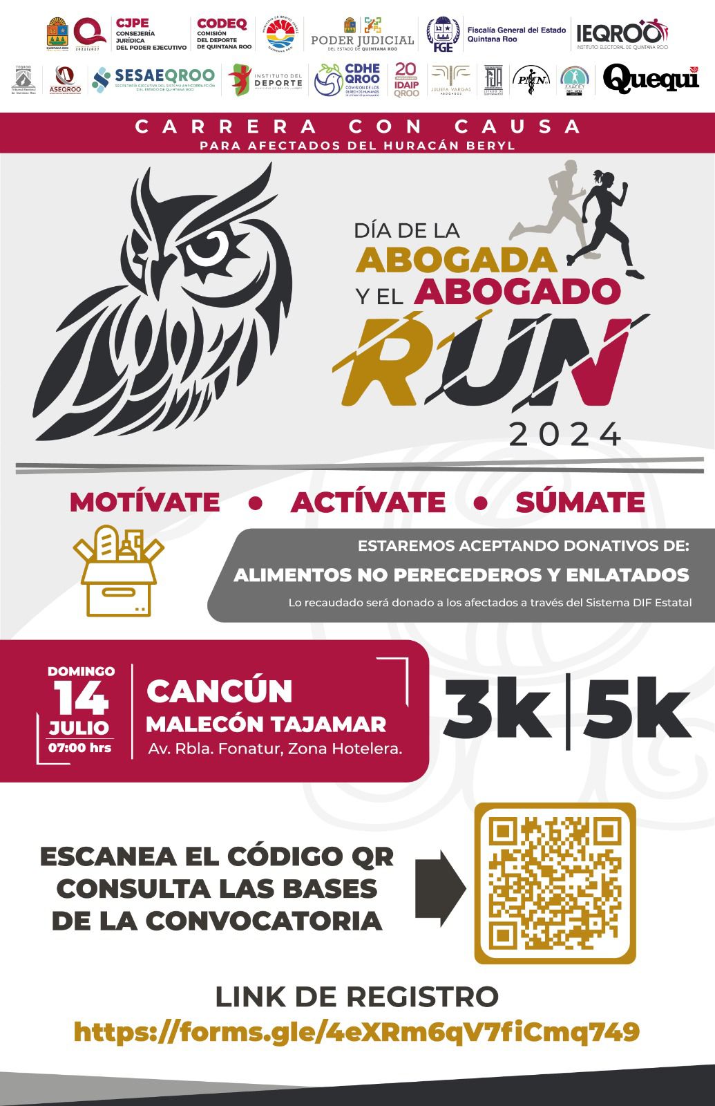 PODER Y CRÍTICA | REDACCIÓN | En el marco de la conmemoración del Día del Abogado en México y como parte del apoyo social a la ciudadanía afectada por el paso del huracán “Beryl”, se anunció la realización para participar en la “Primera Carrera del Día de la Abogada y el Abogado RUN 2024”, programada para correrse el próximo domingo 14 de julio a partir de las 7:00 horas en el Malecón Tajamar-Cancún.