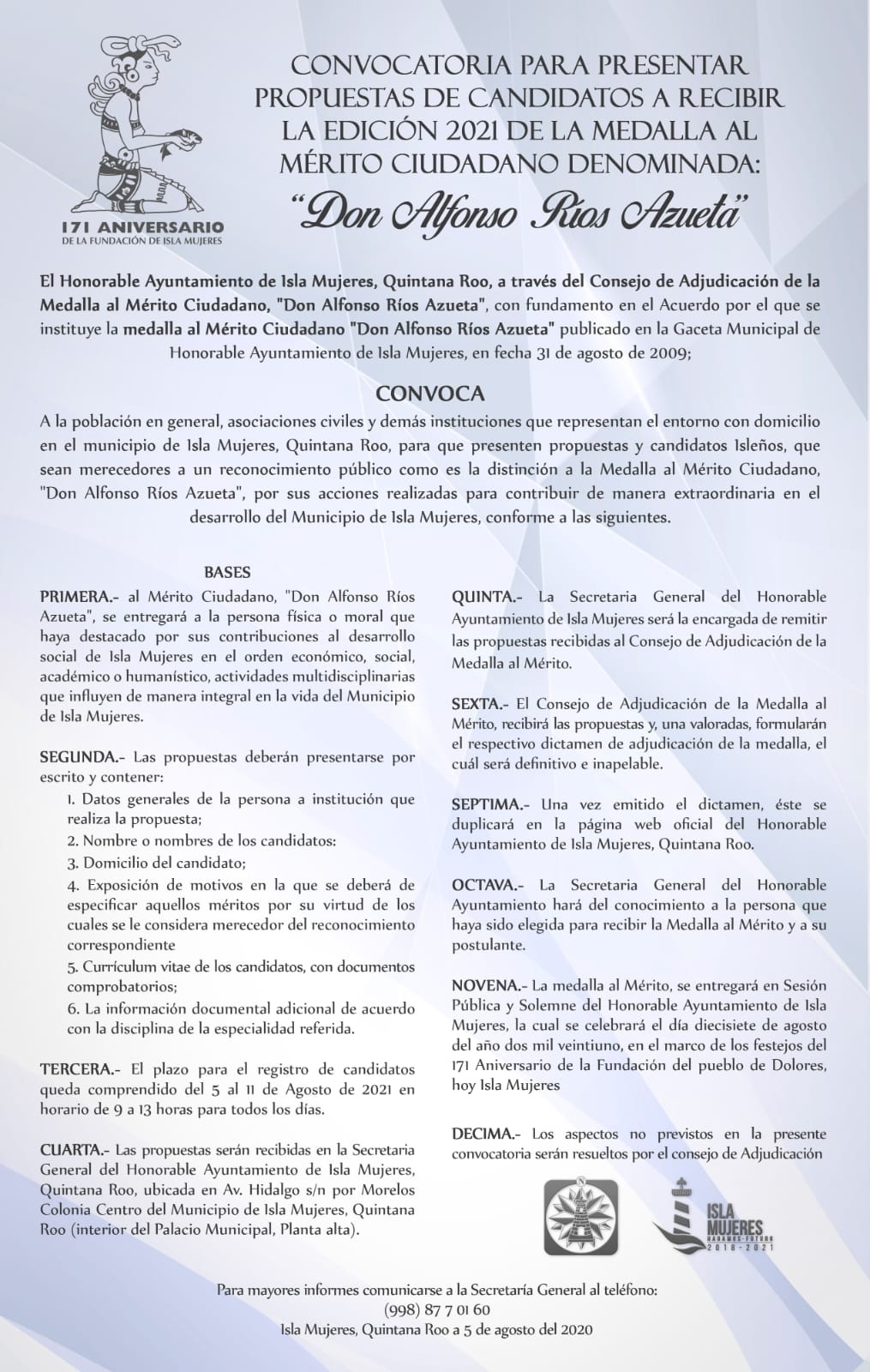 Isla Mujeres, Q. Roo, Jueves 05 de Agosto de 2021, poderycrítica.- Como parte de las actividades conmemorativas del 171 aniversario de la fundación de Isla Mujeres, el gobierno que encabeza Juan Carrillo Soberanis, convoca a la población en general, asociaciones civiles y demás instituciones, a que presenten propuestas y candidatos a recibir la Medalla al Mérito Turístico y Ciudadano 2021.