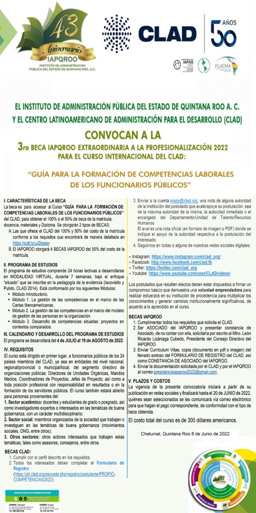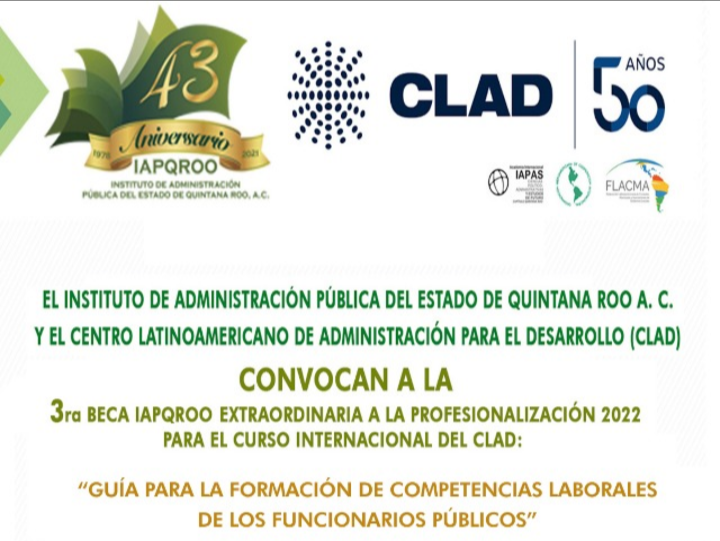 PODER Y CRÍTICA | REDACCIÓN | El Instituto de Administración Pública del Estado de Quintana Roo, A.C. (IAPQROO) en cooperación con el *Centro Latinoamericano de Administración para el Desarrollo (CLAD)* que integra a todos los países de Iberoamérica, convocan a la *3RA BECA IAPQROO EXTRAORDINARIA A LA PROFESIONALIZACIÓN para el Curso Internacional «Guía para la Formación de Competencias Laborales de los Funcionarios Públicos»* que estará a disposición de personas servidoras públicas, investigadores, organizaciones de la sociedad civil que reúnan los requisitos descritos en la propia convocatoria.