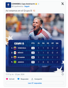 Luego de que la ‘Albiceleste’ se impusiera en la inauguración del certamen a Canadá (2-0), los dirigidos por Lionel Scaloni se apoderaron de la cima del Grupo A, mientras que México finalizó la Jornada 1 del sector B en la segunda posición debido a la cantidad de goles anotados respecto a Venezuela.