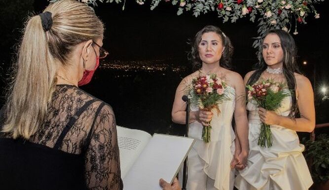 Vestidas de blanco, las dos jóvenes se casaron en la localidad de San Isidro de Heredia, 14 km al noroeste de San José, ante una notaria protegida con cubrebocas, como parte de las medidas para evitar la COVID-19.